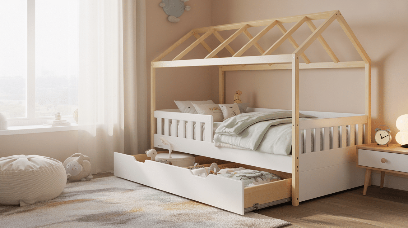 Que le lit cabane avec tiroir pour salon soit douillet et sécuritaire. Concernant l’endroit où placé le lit cabane avec tiroir, il est préférable de l’installer contre un mur en béton afin de le rendre plus stable. Prévoyez un accès facile à l’ouverture du tiroir. Il est recommandé d’éclairer l’intérieur du toit avec une guirlande LED ou une petite lampe adorable. Accrochez une tente ou des rideaux pour faire une petite “maison de lit” agréable pour les contes. À quel matériau faire attention ? Le choix du matériau affectera la durabilité du lit et de l’ensemble de l’image. Si vous aimez le naturel, choisissez le bois massif non transformé. Si vous aimez plus de combinaisons de couleurs, optez pour du MDF certifié. Le lit avec tiroir peut être teint ou peint avec une peinture sécuritaire pour les enfants. Découvrez également les qualités des barres et des rails.